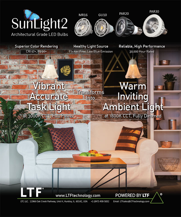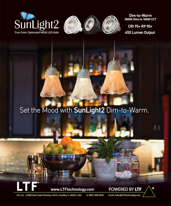 Chicago, Illinois — May 15, 2018 — At LightFair 2018, LTF Technology officially introduced its new SunLight2 MR16 LED bulbs and light engines. Offering outstanding energy efficiency and operational lifetime, these true-color optimized LED bulbs provide all the lighting requirements of halogen bulbs, and can serve as a direct replacement. The SunLight 2 bulbs feature museum-grade color rendering (CRI 95+, R9 90+) as well as dim-to-warm capability (3000K dims to 1800K) and powerful 450 lumen output.